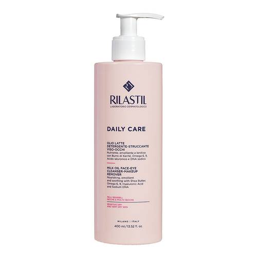 RILASTIL DAILY CARE OLIO LATTE Detergente struccante viso-occhi estremamente delicato con Burro di Karité, Omega 6, 9, Acido ialuronico e DNA sodico, indicato per pelli sensibili, secche e molto secche, ad azione nutriente, emolliente e lenitiva. Rimuove in modo efficace trucco ed impurità, lasciando la pelle vellutata. Senza SLES e SLS. Senza coloranti. Ipoallergenico*. Clinicamente testato. Non comedogenico. Oftalmologicamente testato. Senza parabeni, derivati del grano, oli minerali, lanolina e derivati. Testato per Nichel, cobalto, Cromo, Palladio e Mercurio**. * Prodotto formulato per ridurre al minimo il rischio di allerg...