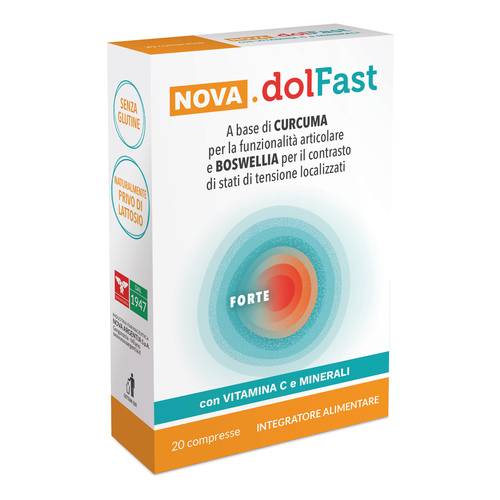 NOVA. dolFastDescrizione Integratore alimentare a base di curcuma e boswellia, con vitamina C e minerali. Proprietà Curcuma: che favorisce il mantenimento della funzionalità articolare. Boswellia: per contrastare gli stati di tensione localizzati e per la funzionalità articolare. Vitamina C: che contribuisce alla normale formazione di collagene per la normale funzione delle ossa e delle cartilagini. Favorisce inoltre la protezione delle cellule dallo stress ossidativo. Manganese: coadiuvante per la normale formazione dei tessuti connettivi ed il normale mantenimento delle ossa. Rame: contribuisce al normale mantenimento d...