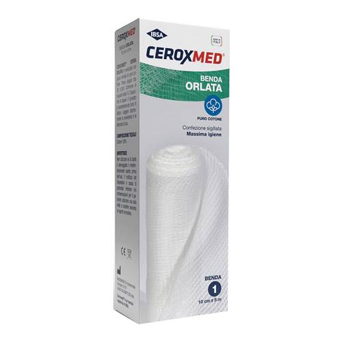 CeroxmedBENDA ORLATA Componenti: benda orlata in garza idrofila di puro cotone. Sigillata e astucciata, disponibile in diverse altezze, leggera e morbida, si taglia su misura e garantisce massima igiene. Formato: 5x5 cm, 5x7 cm, 5x10 cm. Cod. 74020 / 74010 / 74015